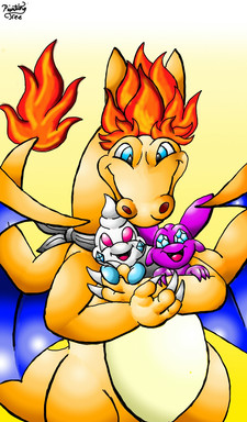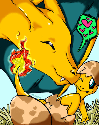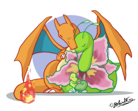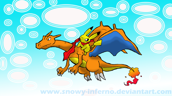 ......Nice artwork, btw, and I have a Charmander(heroine)and Squirtle(partner), too, only both are evolved into a Charizard and a Blastoise!