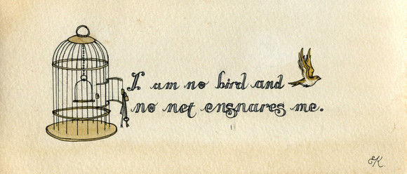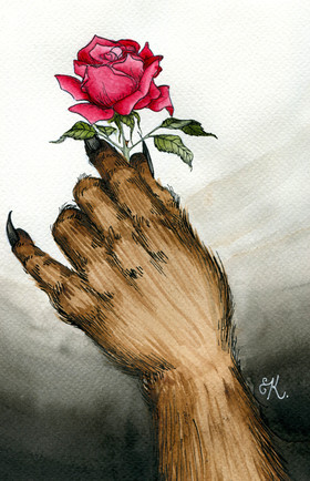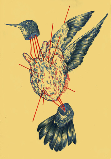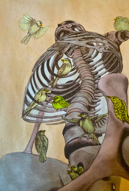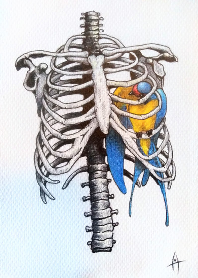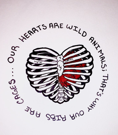 I was inspired by a saying somewhere, though I can't remember where, that hearts were like animals and that's why ribs were called cages. I pictured my heart as a bird, though I used two birds to show two different sides of me.This was also slightly influenced by Frida Kahlo. Not on a visual level, mind you, but a personal level.