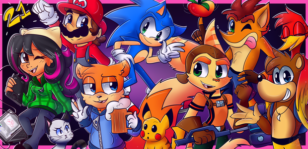 Back when I still had one of those old desktop computers, I was getting the hang of first using my tablet. I often made lots of fanart, but I never made collaborative fanart of all these things I liked in one picture. So early on I started working on one of those cool video game group picture drawings with some of my favorite video game protags over the years! But wouldn't ya guess it. I ran into a lot of problems during the process of making this picture. These problems include 1. Lack of motivation (What's new? lol), 2. Losing my tablet pen and ultimately 3. My desktop pc finally gave in and crashed. And I never got to save my original picture. A sad day that was. Years later (Early/Mid 2016 to be precise), I brought this project back with heavy modifications and improvement! "But Whiskers!" you might say, "You started all the way back in 2016! Why didn't you finish it until now?" Funny thing. My lack of motivation slapped me in the face again. For the longest time, I tried to avoid finishing this due to the fact that I have little to no experience with backgrounds. That was literally the only step that kept me away from completing this. It wasn't until early April I decided to finally get the guts to take a risk in finishing this art piece. So here it is today! the ancient relic I finally completed!as much as I can lol