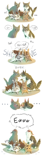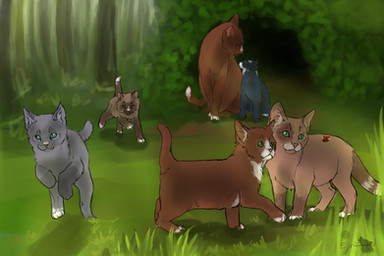 "Look at that," Squirrelflight whispered. Following her green gaze, Brambleclaw saw a number of caves in the hillside, where cats either sat or lay down, someone with kits crawling all over them.