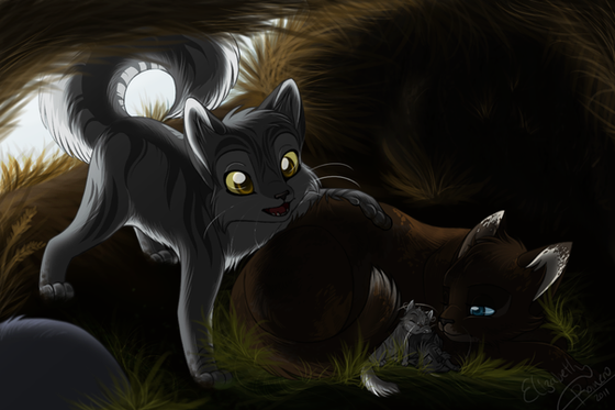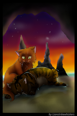 This pic is half fanfic, half KiddosNightmareIt was three days after Leafpool's burial. Lionblaze had offered to help Whitewing when Brambleclaw and Squirrelflight proved to be late. The dead cat was already nicely put in the clearing by the time they returned.