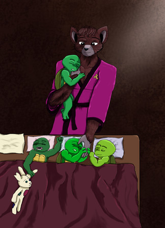 Apparently Splinter is a cat, now, Lol. In all seriousness, rats do lick their young clean and to calm them down for sleep. And like all turtles, Donnie see why his parental figure needs to lick him clean, since turtles are born without their parents. While his brothers sleep after they got a tongue bath, Donnie is confused and wonders why Splinter is licking him clean when they have a functioning bathtub. He probably doesn't like to be touched.Side Note: rats are hard to draw. I've never had to draw a rat before, so some of this is traced from a picture of a real rat. But the rest of it was drawn free hand and using bases I made myself.