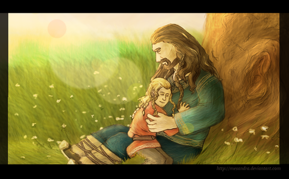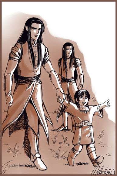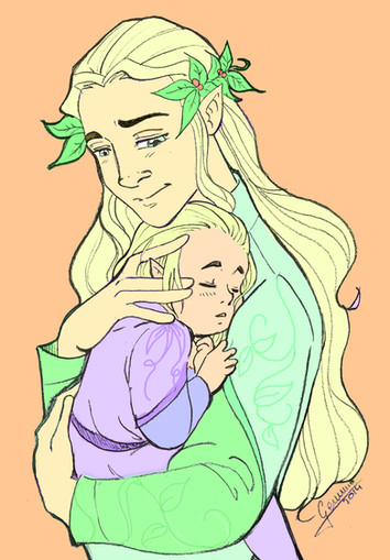 This image is lovely and endearing in many ways. Primarily there is the art which is delicate, bright, organic, and vibrant which is ideal to capture the central theme of joy. Secondly is the composition, the characters and their poses: this is contrary to typical Human behavior in that for most of recorded history and still today (though small changes can be seen) gender roles and the constraints of those roles define and restrict our relationships and expressions of emotion. Something that recently fascinates me about Elf societies (in general) is their lack of gender roles; a child might just as commonly put flowers in their father's hair as their mother's, a father might compose a song about something for his son just as for his daughter, and a mother might teach their children marksmanship even as their father instructs them in swordsmanship. People will love whom they will for their own reasons, no one needs to fit a mold. Parents should love their kids whether they be tender-hearted (girls or boys) or whether they be rough-n-tumble (girls or boys).