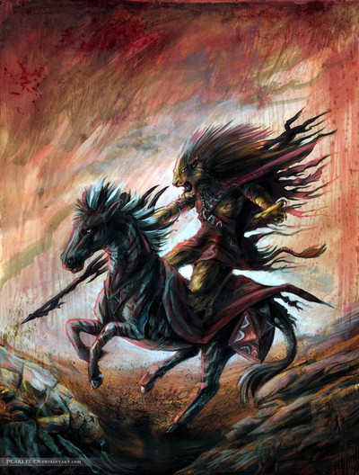 i love how you filled the entire page with movement and texture (i'm a sucker for rule of thirds), and the color saturation really grabs my attention. i'm a bit bothered by the lower half of D's body, though, he looks a bit cramped on top your horaffe (did you make that creature up? verrrry cool design, never seen D ride anything more badass).