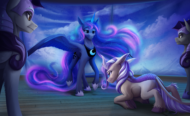 Miło widzieć kolejny staranny obrazek wykonany przez Ciebie i mam nadzieje, że dobrze bawiłaś się podczas streamowania. Jeżeli chodzi o zabawę z błyskiem jej magii to chyba Starlight Glimmer jak na razie znajduje się na pierwszym miejscu, to wygląda naprawdę rewelacyjnie. W porównaniu do RD nie widzę tutaj żadnych niedociągnięć związanych z konturem. Jedynie co chciałabym zasugerować to to, że Starlight Glimmer ma strasznie podobną pozę do Twilight z tej serii, moim zdaniem ciekawiej to wyglądałoby gdyby każda postac miałaby jednak swoją unikalną pozę.