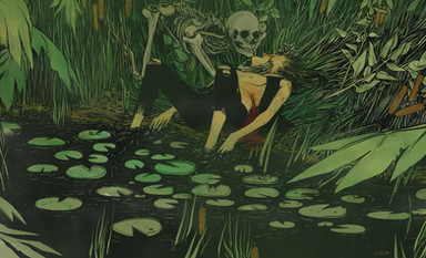 This sort of green I would normally associate with a swamp, but when coupled with black and pretty other navy-ish hues/contrasted with the bright orange... it makes me think of drowning in a cool grotto, which is nice.