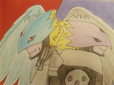 originally two seperate pictures, both were drawn and colored traditionally using a mechanical pencil and prismacolored pencils but I couldnt fit them all on one page so I digitally put them together and added a few things to it like the glow around them and stuffRelated content