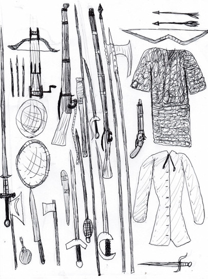I will add a short description. Those are design-concepts for a pen & paper rpg I'm currently working at. The setting at the moment is between bronze age and late middle ages, so most of the drawings of items, esp. weapons and armour is from these periods. First campaign will be around 1450s, so most of my research focused on medieval technology.