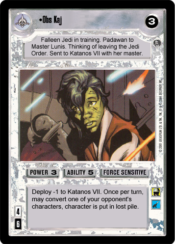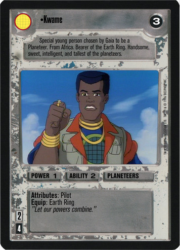 Though I borrowed the template and a few of the parameter names from SWCCG, my intention was for the numbers to represent slightly different concepts, with 'Power' and 'Ability' referring to physical and mental powers respectively. The bottom left numbers would still be deploy and forfeit, but the game text is completely different, with more descriptive ideas of 'Attributes', 'Skills', and 'Equip', plus a quote. The destiny number is the top right more or less correlates to the concept from SWCCG. I used a single icon for every character/vehicle/location etc. from a certain cartoon series, and divided these into two 'teams' for each series, a good team and an evil team. With some cartoons, the heroes/villains did not exist together under a common name, (for example Mumm-Ra is not a member of the evil Mutants, but works with them at times and they are all ThunderCats' villains), so I took some liberties as to how I designated team names.