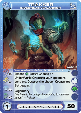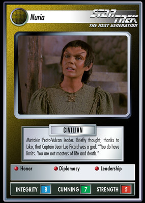 Though I borrowed the template and a few of the parameter names from SWCCG, my intention was for the numbers to represent slightly different concepts, with 'Power' and 'Ability' referring to physical and mental powers respectively. The bottom left numbers would still be deploy and forfeit, but the game text is completely different, with more descriptive ideas of 'Attributes', 'Skills', and 'Equip', plus a quote. The destiny number is the top right more or less correlates to the concept from SWCCG. I used a single icon for every character/vehicle/location etc. from a certain cartoon series, and divided these into two 'teams' for each series, a good team and an evil team. With some cartoons, the heroes/villains did not exist together under a common name, (for example Mumm-Ra is not a member of the evil Mutants, but works with them at times and they are all ThunderCats' villains), so I took some liberties as to how I designated team names.