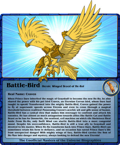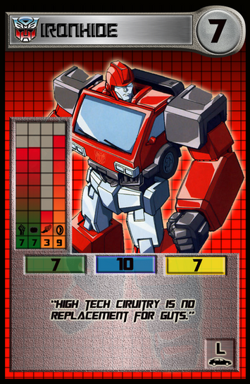 Though I borrowed the template and a few of the parameter names from SWCCG, my intention was for the numbers to represent slightly different concepts, with 'Power' and 'Ability' referring to physical and mental powers respectively. The bottom left numbers would still be deploy and forfeit, but the game text is completely different, with more descriptive ideas of 'Attributes', 'Skills', and 'Equip', plus a quote. The destiny number is the top right more or less correlates to the concept from SWCCG. I used a single icon for every character/vehicle/location etc. from a certain cartoon series, and divided these into two 'teams' for each series, a good team and an evil team. With some cartoons, the heroes/villains did not exist together under a common name, (for example Mumm-Ra is not a member of the evil Mutants, but works with them at times and they are all ThunderCats' villains), so I took some liberties as to how I designated team names.