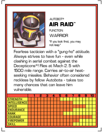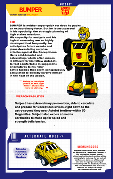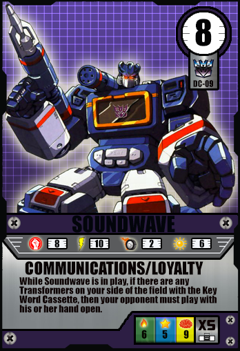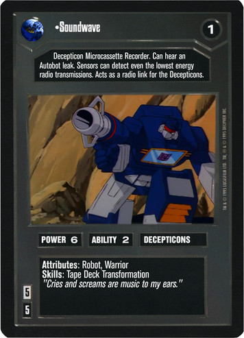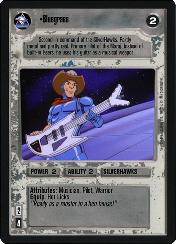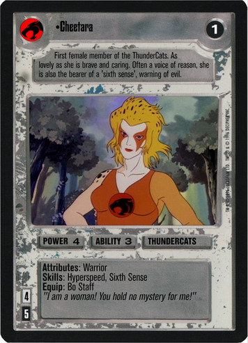 Though I borrowed the template and a few of the parameter names from SWCCG, my intention was for the numbers to represent slightly different concepts, with 'Power' and 'Ability' referring to physical and mental powers respectively. The bottom left numbers would still be deploy and forfeit, but the game text is completely different, with more descriptive ideas of 'Attributes', 'Skills', and 'Equip', plus a quote. The destiny number is the top right more or less correlates to the concept from SWCCG. I used a single icon for every character/vehicle/location etc. from a certain cartoon series, and divided these into two 'teams' for each series, a good team and an evil team. With some cartoons, the heroes/villains did not exist together under a common name, (for example Mumm-Ra is not a member of the evil Mutants, but works with them at times and they are all ThunderCats' villains), so I took some liberties as to how I designated team names.