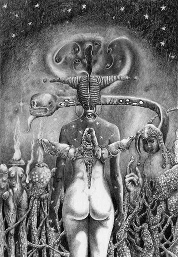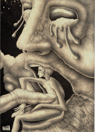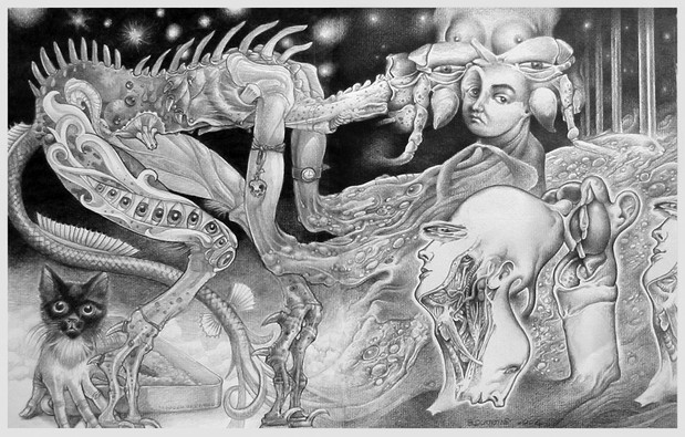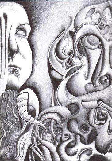 Collaborative drawing between and myself.I drew the upper half and sent it to Janelle with just a strip of the drawing showing, she completed the lower half.