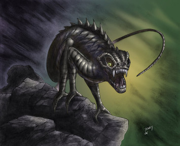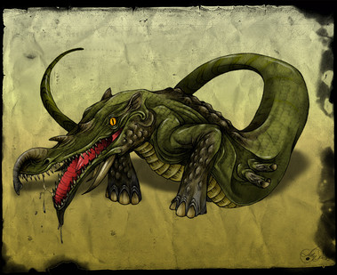 Scholars have seen some specimens being ridden by goblins among the ranks of the Sahaar Orcs. This however is an entirely different breed. It is unknown how the Beastmasters of the swamps managed to tame these creatures as their vicious and impulsive behavior would imply such a thing to be impossible. The most common and dangerous trait among Basilisks is their petrifying gaze which they will use any chance they get.(Petrifying gaze)