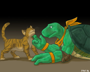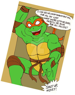 roflmao, I love that. I can totally picture that scenario. I love it. xD My man(turtle) has sensitivity...and ofcourse Mikey-turtleboy hasta go and expose it (in a good nature way ofcourse, lol)