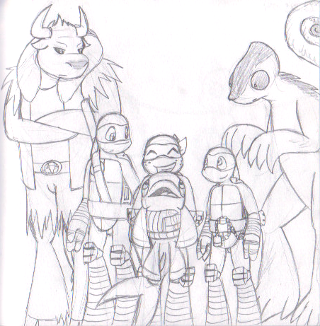 This request has been sitting on my plate for far too long, and I had a chance recently to sketch it out. It was fun to take a break from all the stuff I'm working on.asked me to draw a fanfic scene with Donatello speaking to Dreadmon and Mondo Gecko. I'm not all that familiar with the Mutanimals, so hopefully this rendition is OK. X)