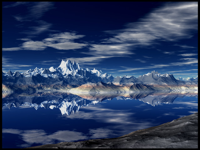 The RiftQuick job in Terragen and Photoshop. Rendered a little larger than I usually do - 3200x2400 instead of 2800x2100 - so I think quality improved somewhat. The name comes from the focus at the center, where the sun seems to be permeating through clouds and forcing them away. This piece had minimal postwork aside from the border and some sharpening, all the colors and such were in Terragen. Midwinter vacation is coming up in about a week, expect some more new stuff then.