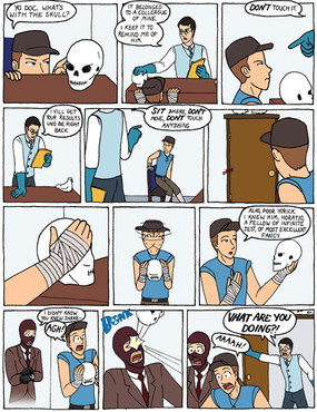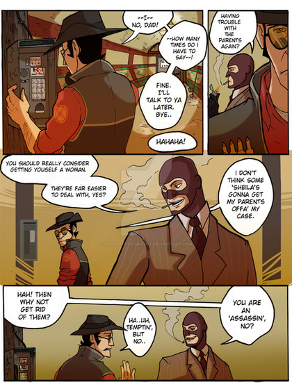 Spy and Sniper decided to pee in a jar and see who can pee more? Spy,that's disgraceful of you to do such uncivilised things! I'm dissapointed in you.