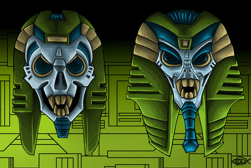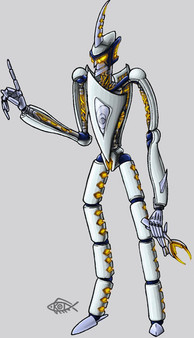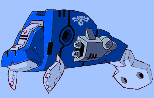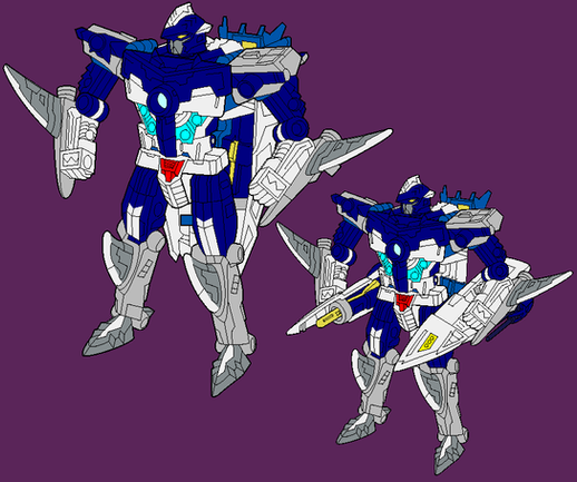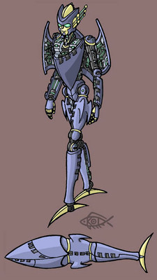 Ink on paper, coloured in Photoshop. Character design for pre-Beast Wars Depth Charge, based on the Transmetal toy. This design is meant to show Depth Charge as he was before Rampage happened. As with Convoy Primal, a lot of the detail is taken from the toy - the details on the wings, the overall look and transformation, the forearms, the colour scheme, and especially the head.The transformation is pretty much the same as on the toy, save for some fiddling with the way his legs go around his chest-module. I used Depth Charge's toy as a model for the general look and colour palette of all the Omicron colonists, keeping features such as the shape of his head and his M-shaped "belt buckle." I wanted Depth Charge to have a more mechanical aspect than his Beast Wars for, hence the "cockpit" lid over his head. Depth Charge was one of the first design I did from this sequence of characters, and I'm still quite pleased with how he came out; he looks big, solid and powerful, as he should.