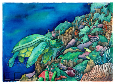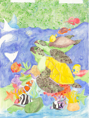 This was a demonstration piece for my art 1-2 courses for their open competition (most chose Bow Seat Ocean Awareness Competition). Watercolor base with details in watercolor pencils. I used a couple of reference photos to create this final piece (the turtle was mine from years back; the oil was some reference online), however, nothing was duplicated in any form, so I'm not going to dig around for the images I pieced together over a year ago.