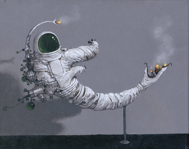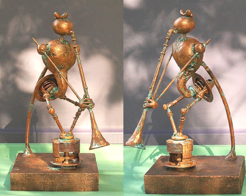 The first thing I thought when I saw this was how much I loved the blue marbled-ish background brings the character to life... An orgainic musical machine-being living in a world of royal blue/violet skies of wispy, foggy clouds.