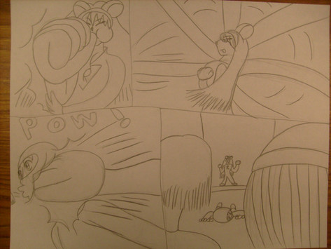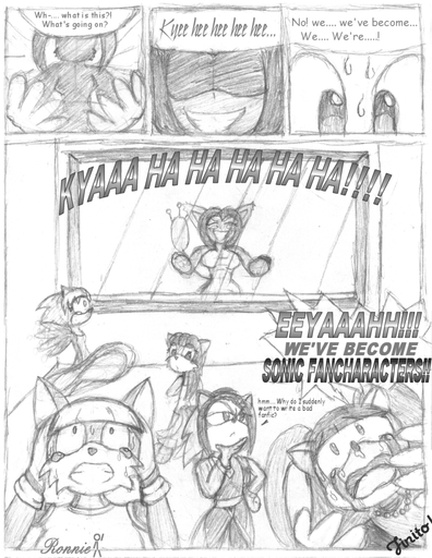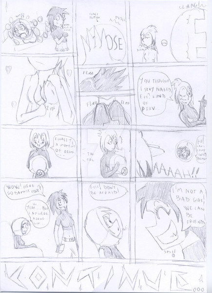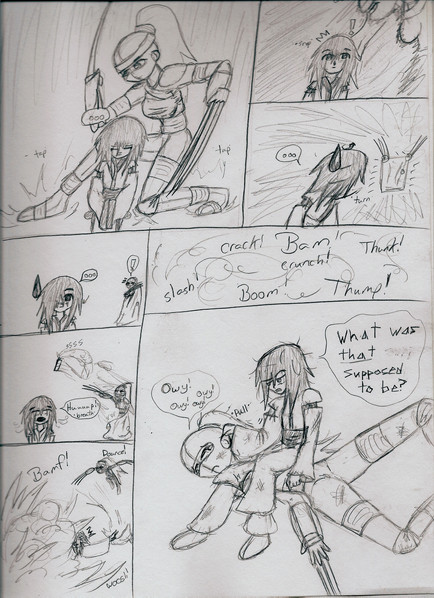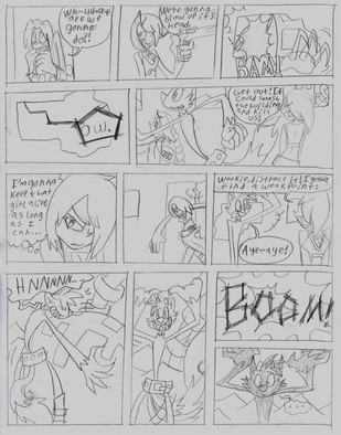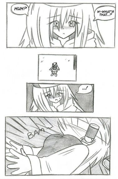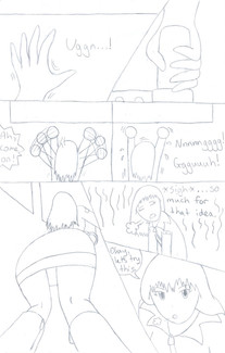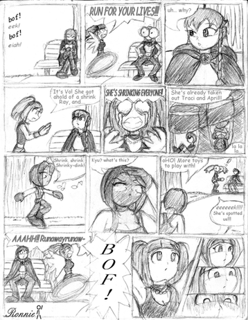 One thing that bugs me is that, in each of my comics, the hand style changes from panel to panel. maybe I'm trying to fit too much detail into smaller areas, or perhaps I shouldn't be doing 4-row layouts..? Also, I KNOW the big feet don't count in the growing/shrinking category, I just did that for fun. '_';
