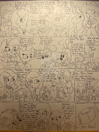 I recently got a new sketch book that is the ideal sketch book for cartoons, comics, and graphic novel pictures. So I came up with this small idea with the Nintendo characters interacting with the MLP characters. The results are impressive. I never thought that I would be able to make an authentic manga and I still can't get over it. Like any other professional artist, I just had to sketch the outlines and text, then go over it with sharpie, erase the outline, shade in whatever was necessary. Now I had to take a picture of it with my camera and I apologize if it's a little dull. I do the best I can to try to make it fit in one shot. I have more of these planned, but that doesn't mean you can stop leaving requests for me. And as always, comment, favorite, and enjoy.Mario, Luigi, and Bowser © Nintendo