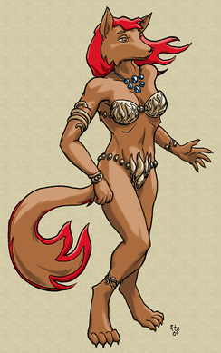 A hand colored printout of the inked version. Done with colored pencil and some markers.Ocker skin (?) and walnut brown hair and tail. Thats what ik said on the pencil and marker.