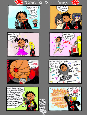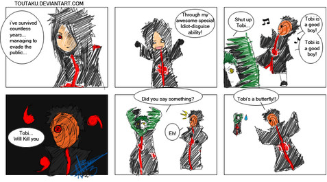 OMG YOU A TOB I FANGIRL I ALSO BELIVE TOBI IS OBITO Also leader should really give zetsu and deidara some more money.but if they do kakuzu would kill them ._.