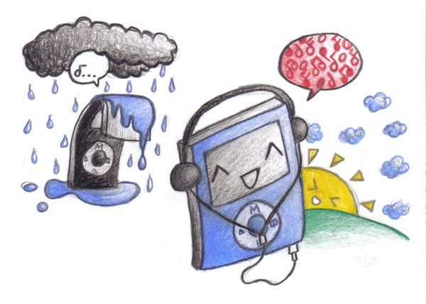 Originally, this picture included a sad little first gen. iPod Nano in the background, with rain falling on him. However, for multiple reasons including the fact the colours were too similar, I decided to cut him out and just have this happy iPod as the final product.