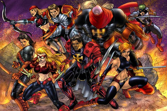 The characters here are (from left to right)... Flare - a mutant thief, Dreadnought (a kind of rookie Iron Man), Paragon (wonder woman with a sword!) Dave (out of his league sorceror's apprentice), Metatron (mysterious mute assassin) and Vigil on the end!
