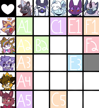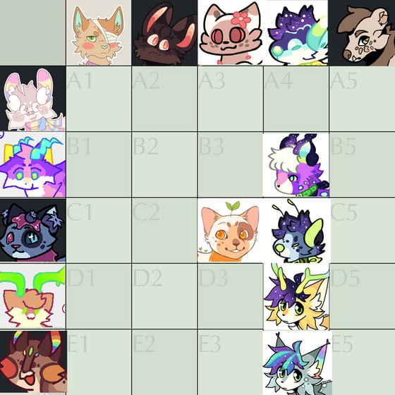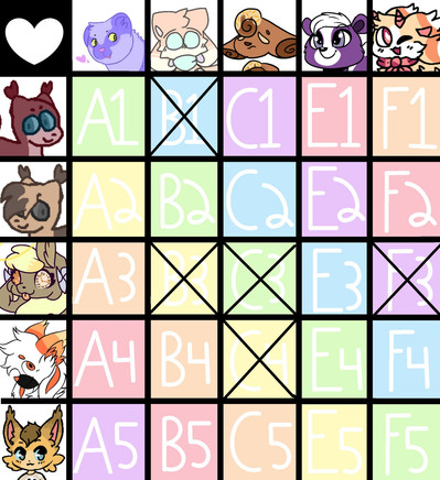 so because of my exams making me less active I thought I'd open another grid so I could get a few more designs out while I'm studying, these results aren't SnailTailz though, just normal designs this time so sorry if you wanted more Snailz.Each PURPLE slot is 100 Points, each YELLOW slot is 150 Points! (more expensive as they're customised)
