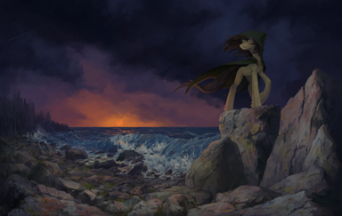 wow the way you set the scene is fantastic! i love the gloomy colors and how well you made the oc fit its environment! Gorgeous work!