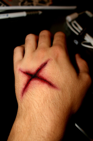 Put blood splatters on every metal parts that cross the skin (example: on the hook and screws).