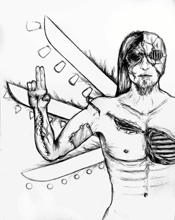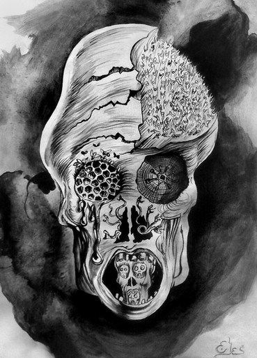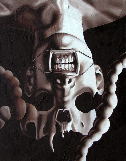 Striking piece. The teeth look great. I don't know that the hooks and implementation need particular angles, but I think more would definitely be better, coming from all different angles. Any way to work some rust or stains in there? The right side seems neglected in terms of tension; it just doesn't have the lines that the left side does, so that's where I'd pull more of your muscles.