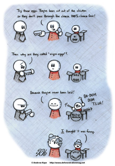 What I imagined was that there'd be no text in any of the frames, and in the last one he'd simply say, "my penis fell off".