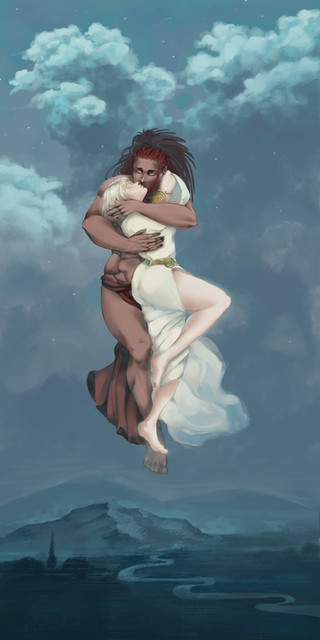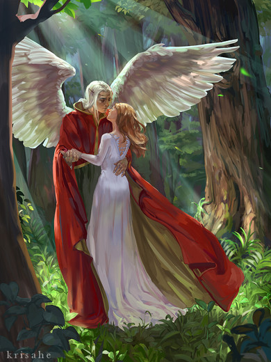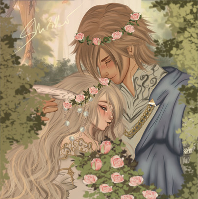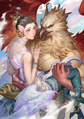 this is lovely! you did such a great job with the character designs (especially the female's birdlike wings paired with her fairy like posture), the color scheme, the lighting/shading effects, and the background is awesome as well. fantastic work once again!!!