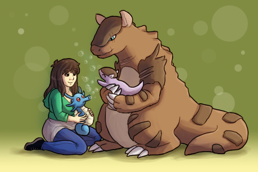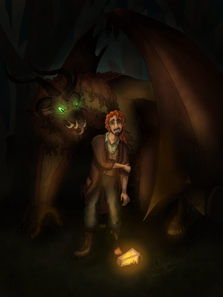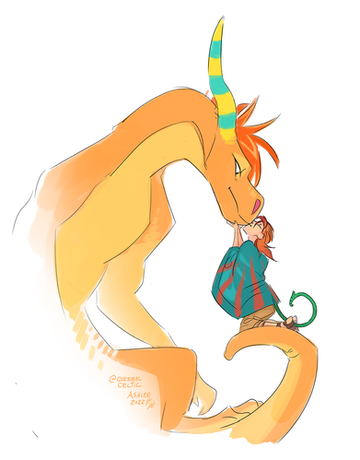 I did an art trade with ! (Please don't take this as a sign to ask about art trades, this was a very special exception haha)If you know me, you probably know Rooke, unless this was before your time. She has a very awesome finished Nuzlocke comic (in which I helped with the coloring and backgrounds a bit), and these characters here are from her new original comic which is also very awesome already! It's about a lost kingdom in the sky and big floofy dragons, and all the characters are the sweetest creatures on the world. This exceptionally floofy dragon is FarΓ³l, and his human is Rozali the bard (and protagonist).