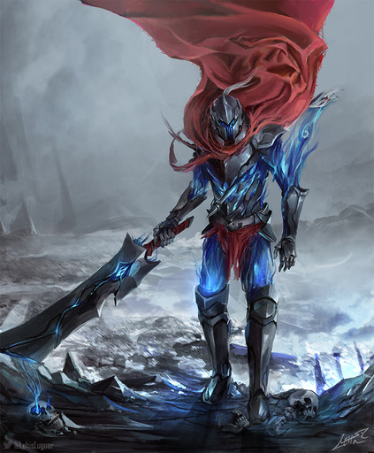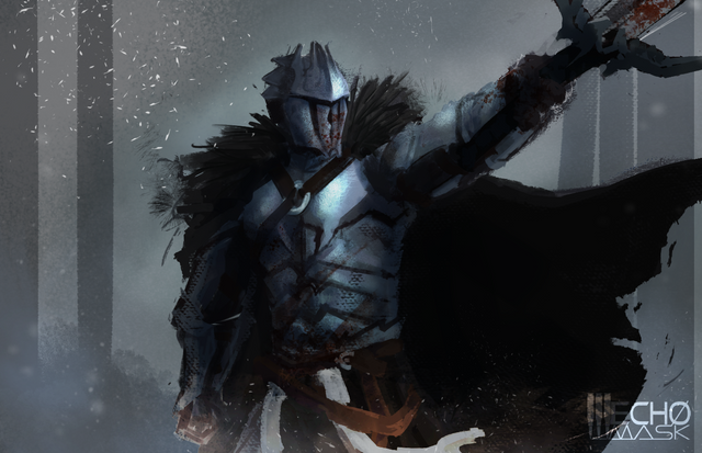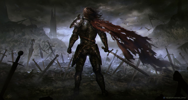 That knight looks crazy cool i didn't even notice the syfy element at first until i saw the blood on the sword wasn't red an then i looked at the background an saw the spaceships an i was like no wonder he looks like he been thru some stuff he just killed aliens seriously this is cool