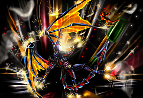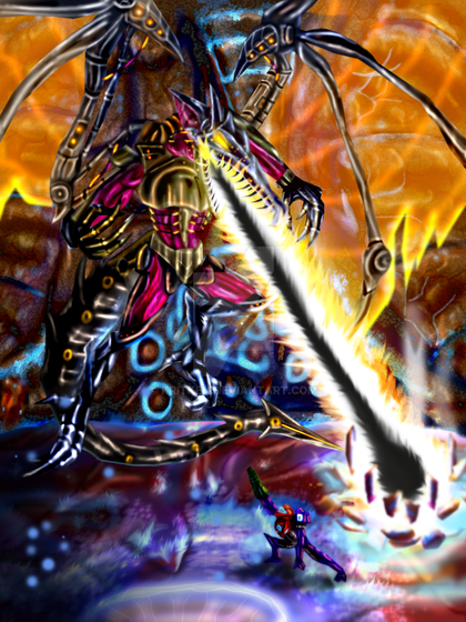 A drawing of the battle agaist ridley from super metroid.This battle is mostly what the player is been waiting for througthout the whole game scince you saw him on the begining stealing the metroid larva.