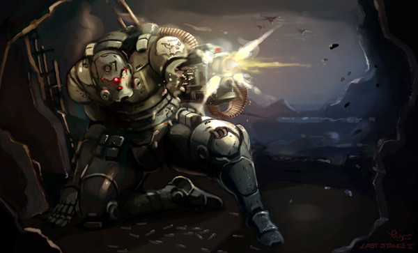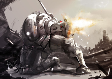 There are certainly more technically adept ones, more unique concepts, more clean linework and mind-boggling detail, but this one captures everything I like about the mech concept. The design appears plausible, and uses the clean, white futuristic coloration that I have a soft spot for, but it's how well you've captured the scene -the chaos, desperation, stead-fastness, and violence of action- that really makes this great.
