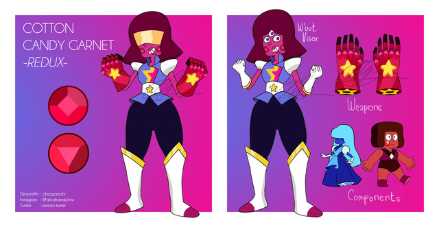 Extra: In normal daylight [relatively low levels of UV], she is a small, average looking Ruby, but unable to summon a weapon. However, when exposed to extra Ultraviolet light, she is able to convert the light into her own form, like an external battery. This means she gets bigger, stronger, and is finally able to summon a weapon: a Galaxy Gauntlet.