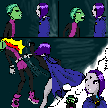 He had better watch out is right, because although she does--by the comics ("Life or Death" issue #30 & issue #42 of TTG!--harbor a soft spot for him (meaning that, though she is annoyed by the fact that he tries to hard, she can't help but appreciate his perseverance and dedication, especially considering her own insecurities surrounding herself), she can still pack a punch when angered enough (cue "Rage" Raven being released from her confines within Rae's mindscape).