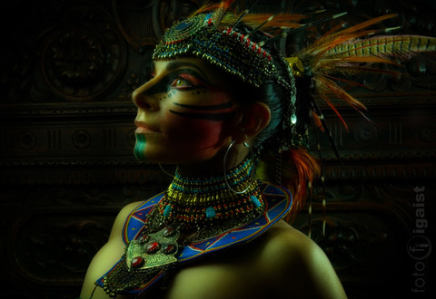 Sehr aufregend wie diese Ketten und Pailletten ihre vollen Brüste umspielen und ebenso wie der Lendenschurz aus Goldschmuck nur das Nötigste bedecken. Gleichzeitig wird dem Betrachter der unermessliche Reichtum der "Aztec Goddess" demonstriert, welche ihr Gold in absolutem Überfluss zur Schau stellt.