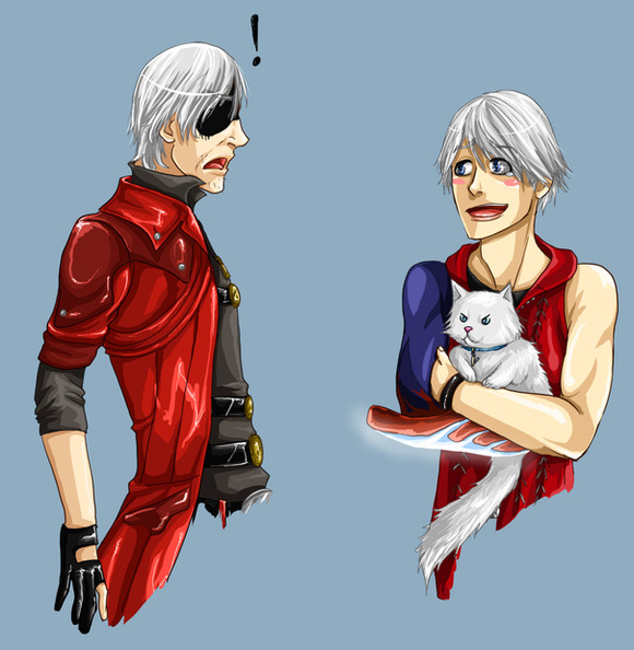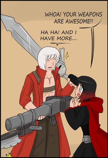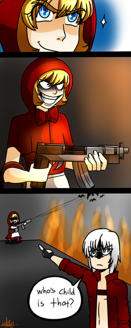 the red man with sword and gun, meets the red girl with sytche and gun.