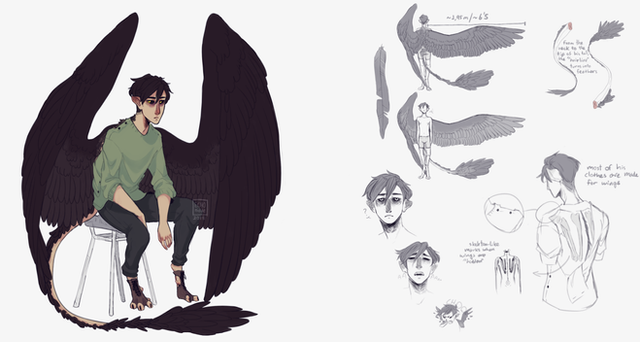 He uses shadows to fill his wings. The Worse is drawing the entire wing bones, then hidding it