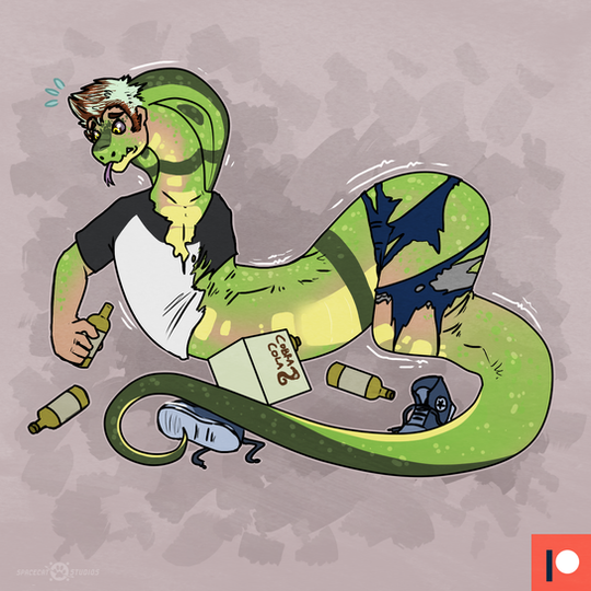 A man turns into a snake as he reads the warning label on a bottle of what happens to be a TF potion.
