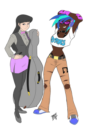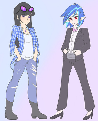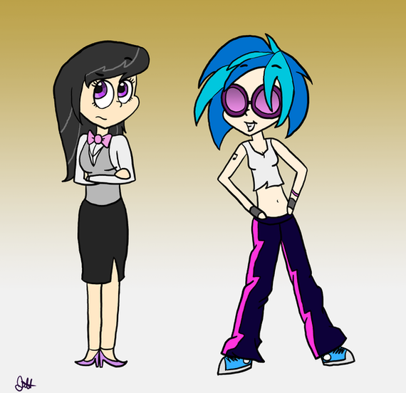 Well, I'm back again. College has been taking up most of my time, but regardless I'll still try to be active. Anyways, more human pony art, this time it's Octavia, Vinyl, and Lyra!!!!!!! Well in reality, I actually drew this picture back in May 2014.................which was a long time ago. I always end up coloring my pictures at a later date due to time constraints, and I hate that. Back on topic, it's the musical trio that I originally planned on drawing..........back in 2012, except I actually drew it this time. I also drew Bon Bon right next to Lyra prior to coloring it, but I didn't like how she looked and I so removed her. Fear not, I'll draw Bon Bon another day......or maybe next year.Β Anyways, I had fun coloring this picture. I planned on adding shading similar to The Great and Powerful Trixie , but it didn't fit well.Colored in GIMP