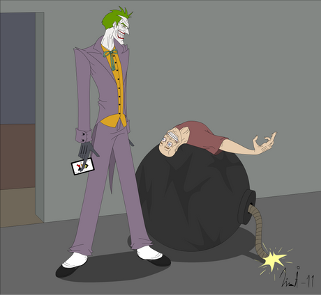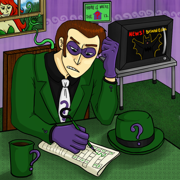 You know, I've seen you draw plenty of things, yet nothing you've drawn portrays as much passion and dedication than these six drawings. From the bat signal in the sky in Batman's picture to the giant bomb and smiling victim in the Joker's, the flag-gun in Harley's and now the machine with the rhyme scratched in in the Riddler's, your attention to detail and the characters' personalities astound me. You're really working hard with these, I can tell, making them as perfect as you can.