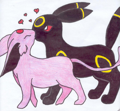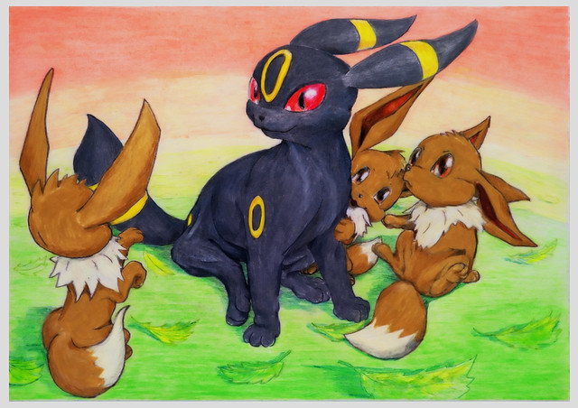 Siis tämä on ihana : D Umbreon ja Espeon ovat molemmat suosikkejani, kaikkien muidenkin Eeveen muotojen rinnalla. Kaunis perhepotretti ei voi muuta sanoa <3 Vesivärityö on aina kaunis, etenkin kun aihe on näin suloinen.